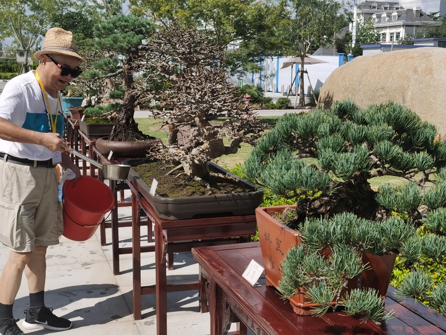 创作者给盆景浇水,越大的盆景照料起来就越不容易,忙碌的上班族望而却步。 陈玺撼摄